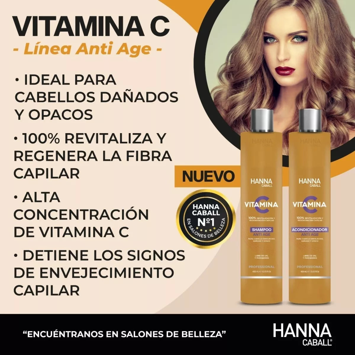 Anti Age - Vitamina C Hanna Caball son productos que revitaliza y regenera el cabello por su alta concentración de vitamina C, fortalece la hebra capilar, activa la producción de colágeno obteniendo rápidamente un cabello sano, resistente, nutrido y con brillo. Ideal para cabellos envejecidos, dañados y opacos.